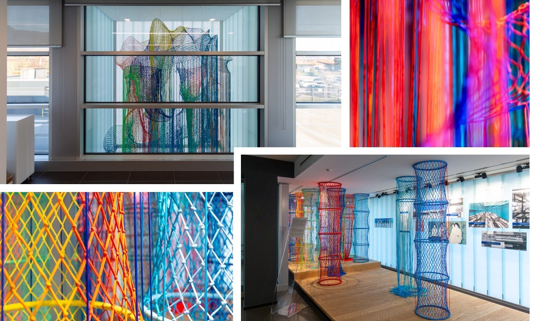La collocazione dell’installazione all’ingresso della sede aziendale ne rafforza il senso: Net Positive diventa un luogo in cui le connessioni si generano, si intrecciano e aprono nuovi percorsi. Come suggerisce il titolo, l’installazione diventa una metafora di relazione positiva, una rete di legami, energie e possibilità che si attivano nello spazio e tra le persone.