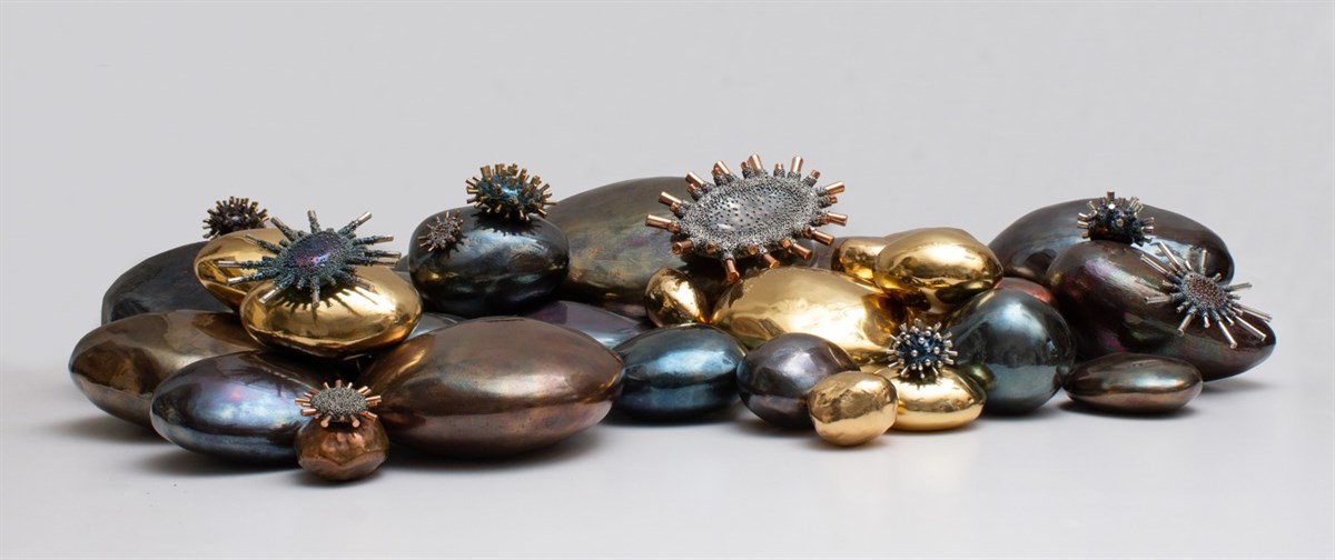 Il Sasso è simbolo e filo conduttore: primordiale e al tempo stesso trasfigurato, incarna la tensione tra pesantezza e leggerezza, immanenza e pensiero, visibile e invisibile. Rivestito di rame dorato o reso magnetico, diventa gioiello indossabile, portatore di energia ancestrale e memoria, un segno che guida lo spettatore in un senso profondo di comunione con la natura umana.